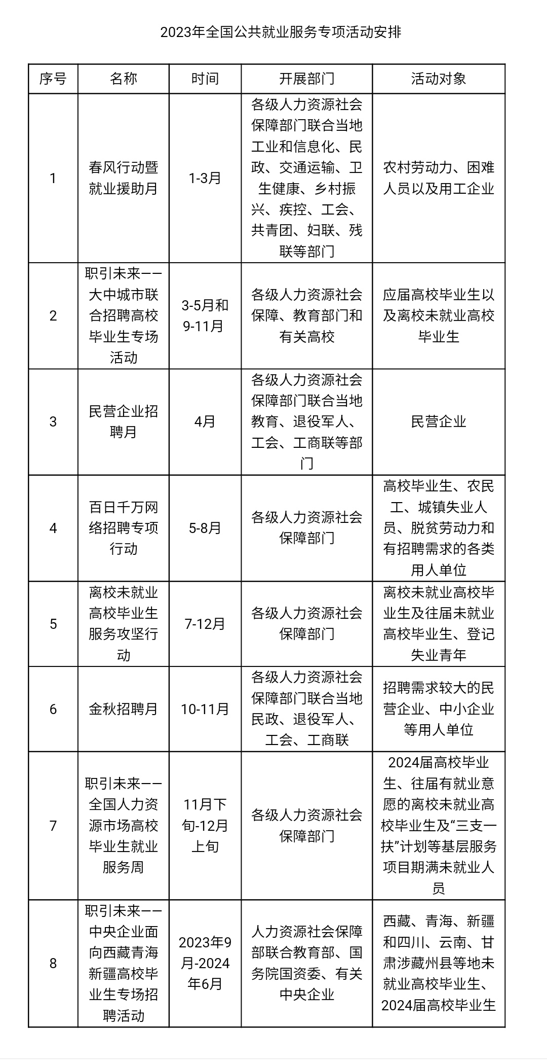 为全面贯彻落实党的二十大精神和党中央、国务院关于稳就业决策部署,进一步健全就业公共服务体系,推进实施提升就业服务质量工程,促进高质量充分就业,现就2023年全国公共就业服务专项活动有关事项通知如下: